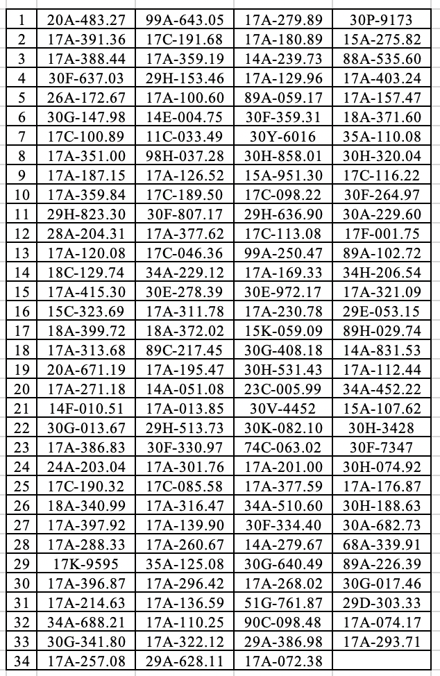 30F-214.97, 99A-622.67, 30K-633.68, 17A-168.29, 15K-183.71, 14C-409.13, 14A-410.97, 17A-401.95, 15A-192.66, 81C-243.55