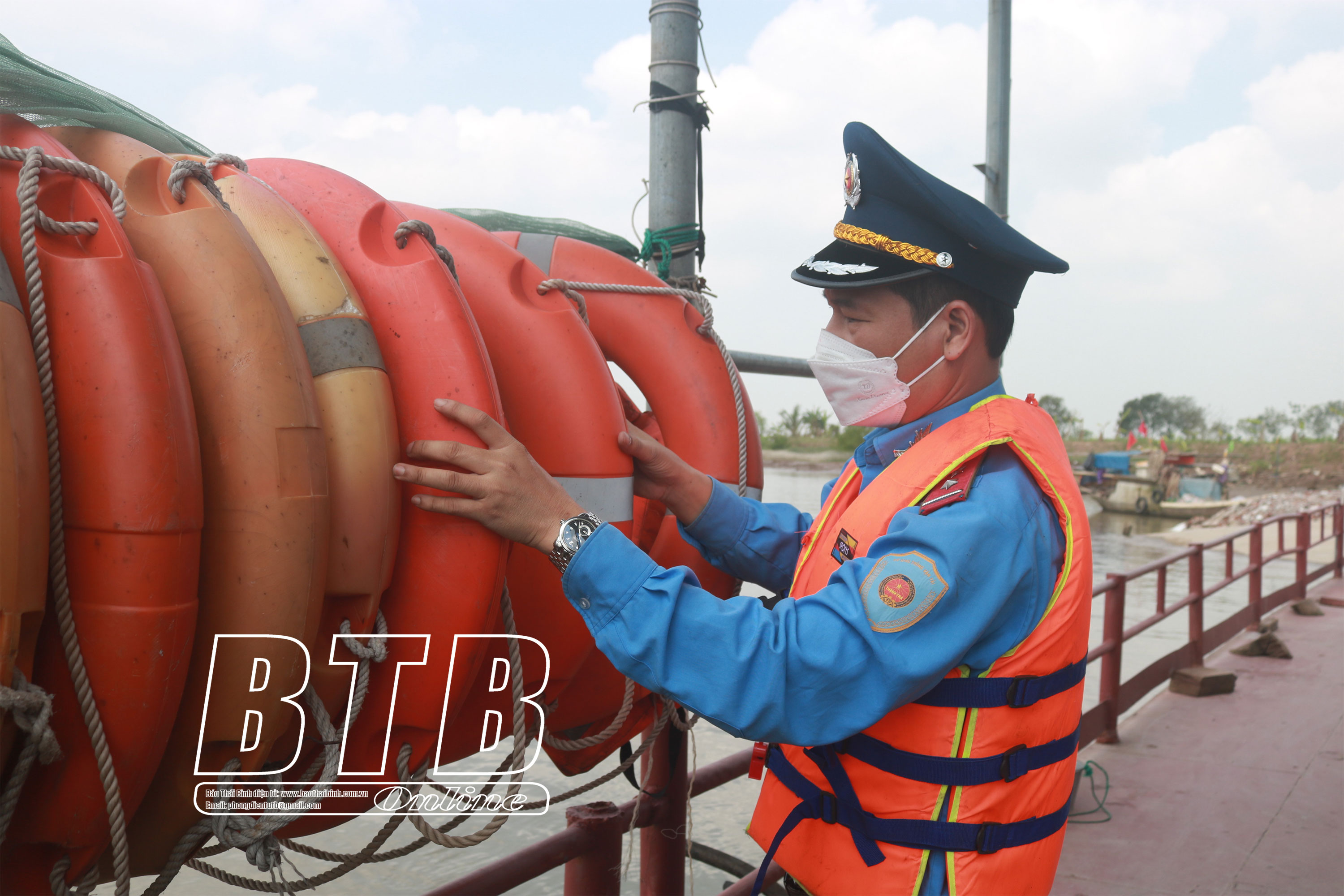 Lực lượng chức năng kiểm tra phao cứu sinh tại các phương tiện vận tải khách.
