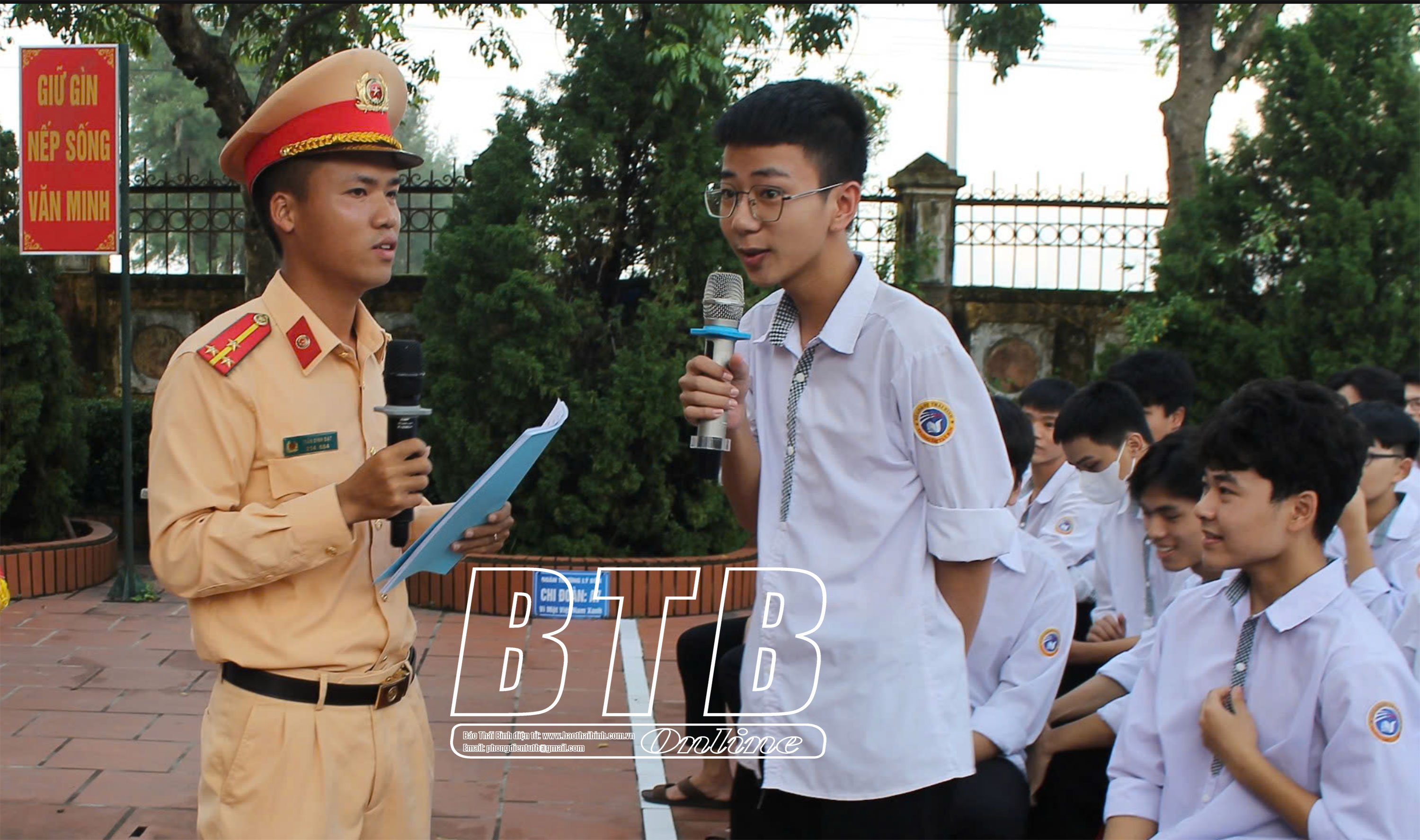 Lực lượng CSGT huyện Vũ Thư tuyên truyền Luật Giao thông đường bộ cho học sinh Trường THPT Lý Bôn.