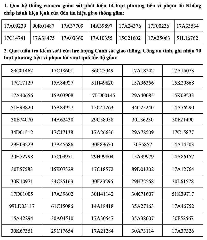 Theo đó, thông qua hệ thống camera giám sát thông minh tại các nút giao thông trọng điểm trên địa bàn tỉnh Thái Bình và công tác tuần tra kiểm soát, lực lượng cảnh sát giao thông ghi nhận và xử lý 84 trường hợp vi phạm trật tự an toàn giao thông. Các trường hợp vi phạm giao thông chủ yếu là không chấp hành hiệu lệnh của đèn tín hiệu giao thông, vượt quá tốc độ quy định, không chấp hành hiệu lệnh, chỉ dẫn của biển báo hiệu, vạch kẻ đường. Trong đó, lỗi vượt quá tốc độ chiếm nhiều nhất với 70 trường hợp; lỗi không chấp hành hiệu lệnh của đèn tín hiệu giao thông là 14 trường hợp.