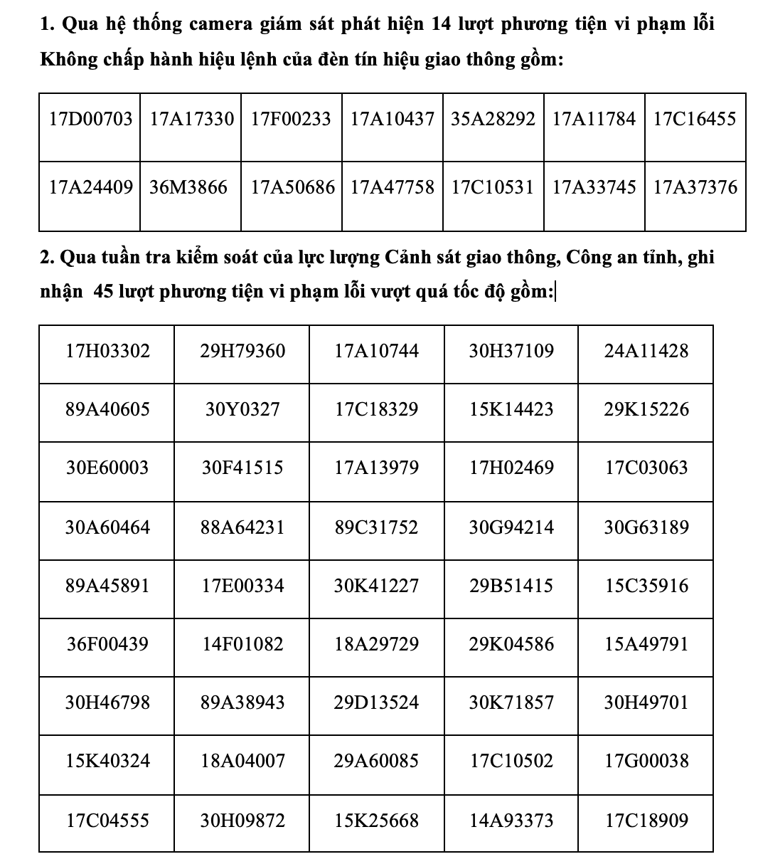Theo báo cáo của Phòng Cảnh sát giao thông (Công an tỉnh), từ ngày 27/11-3/12, lực lượng cảnh sát giao thông đã ghi nhận 59 trường hợp phương tiện vi phạm Luật Giao thông đường bộ bị xử lý phạt nguội.