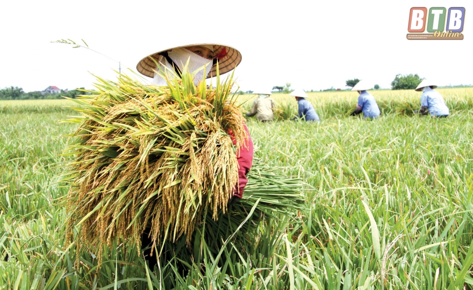 Nông dân xã An Quý (Quỳnh Phụ) thu hoạch lúa mùa.