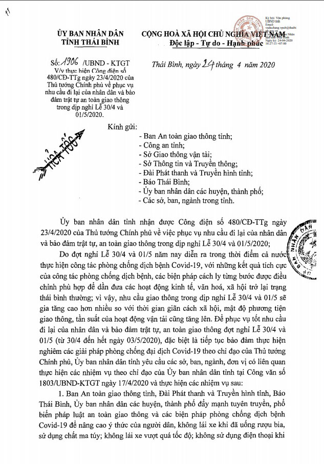 Về việc thực hiện Công điện số 480/CĐ-TTG ngày 23/4/2020 của Thủ tướng Chính phủ về phục vụ nhu cầu đi lại của nhân dân và bảo đảm an toàn giao thông dịp nghỉ Lễ 30/4 và 01/5/2020
