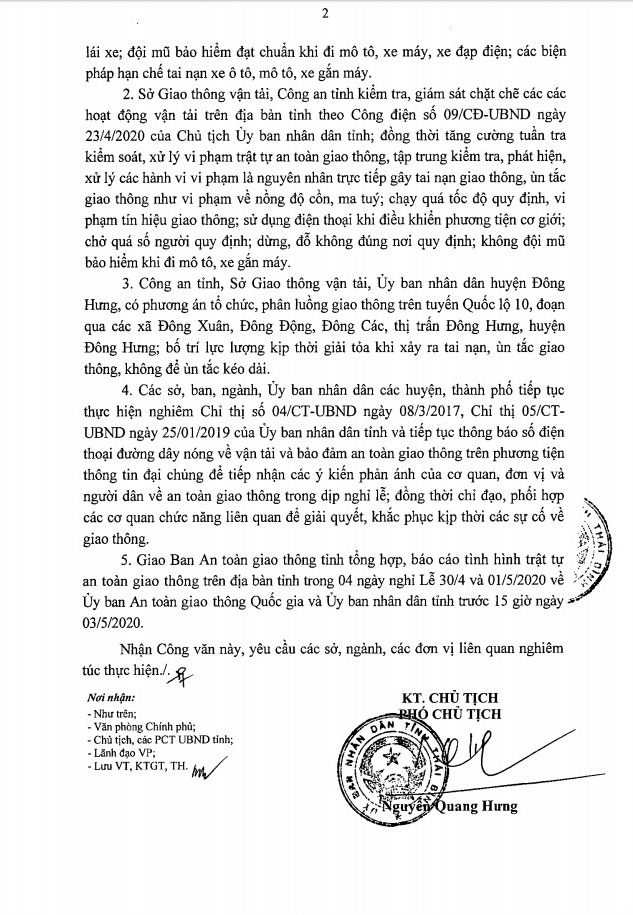 Ngày 24/4, UBND tỉnh ra Công điện số 1906/UBND-KTGT về việc thực hiện Công điện số 480/CĐ-TTG ngày 23/4/2020 của Thủ tướng Chính phủ về phục vụ nhu cầu đi lại của nhân dân và bảo đảm an toàn giao thông dịp nghỉ Lễ 30/4 và 01/5/2020.