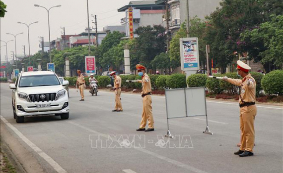 Cán bộ chiến sỹ Phòng CSGT lập chốt tại đường Lê Đức Thọ, TP Điện Biên Phủ để tiến hành kiểm tra các lái xe. (Ảnh: TTXVN)