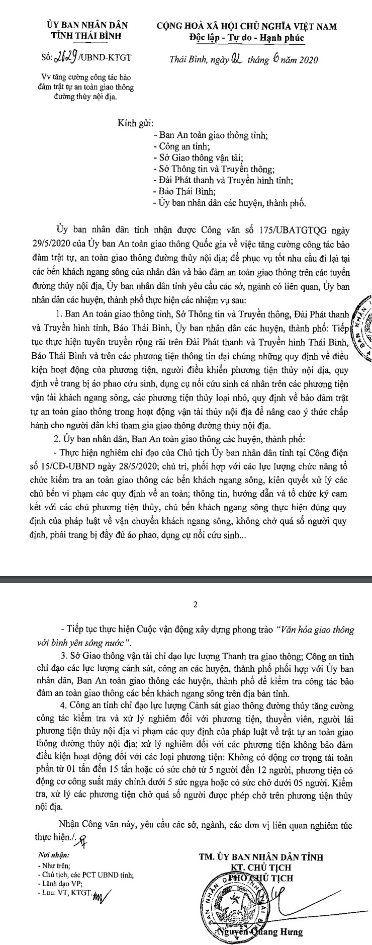 Ngày 02/6/2020, Ủy ban nhân dân tỉnh Thái Bình ban hành Công văn số 2629/UBND-KTGT về việc tăng cường công tác bảo đảm trật tự an toàn giao thông đường thủy nội địa.