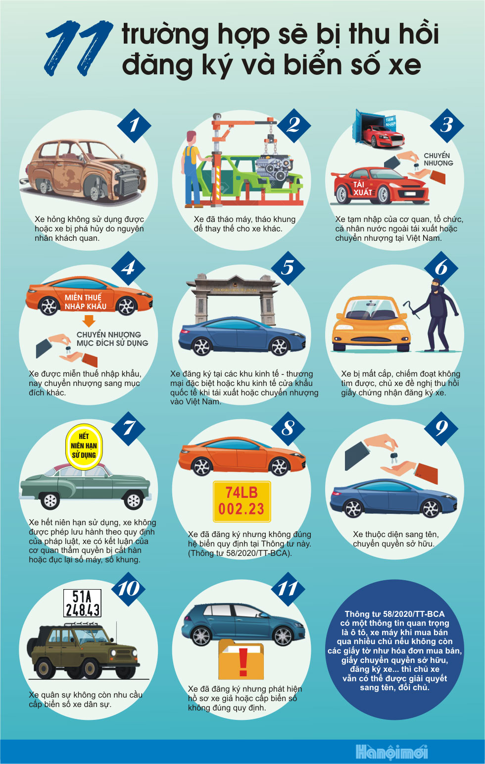 Bộ Công an vừa ban hành Thông tư 58/2020/TT-BCA quy định quy trình cấp, thu hồi đăng ký, biển số phương tiện giao thông cơ giới đường bộ. Theo đó, từ 1-8 tới, 11 trường hợp dưới đây sẽ bị thu hồi đăng ký và biển số xe.