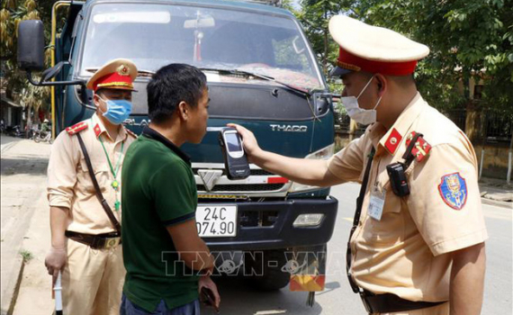 Lực lượng CSGT đo nồng độ cồn của tài xế lái xe. (Ảnh: TTXVN)