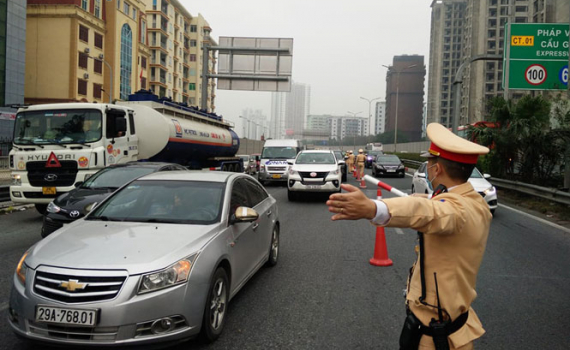 Lực lượng cảnh sát giao thông làm nhiệm vụ trên tuyến Pháp Vân - Cầu Giẽ.