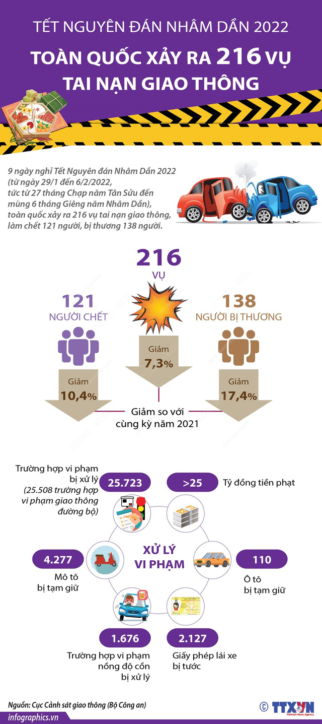 9 ngày nghỉ Tết Nguyên đán Nhâm Dần 2022 (từ ngày 29/1 đến 6/2/2022), tức từ 27 tháng Chạp năm Tân Sửu đến mùng 6 tháng Giêng năm Nhâm Dần), toàn quốc xảy ra 216 vụ tai nạn giao thông, làm chết 121 người, bị thương 138 người. So với cùng kỳ năm 2021 giảm 17 vụ (7,3%), giảm 14 người chết (10,4%), giảm 29 người bị thương (17,4%).