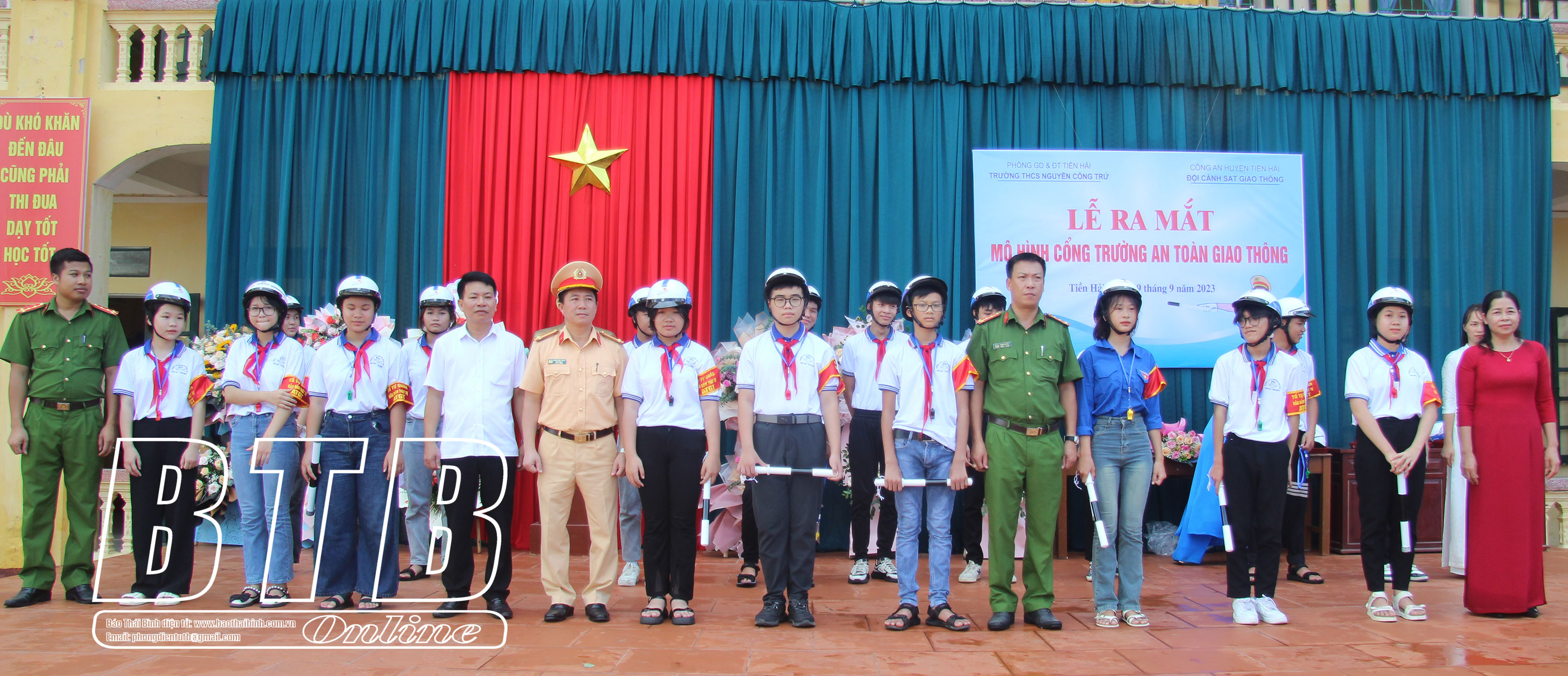 Ký cam kết bảo đảm trật tự an toàn giao thông và ra mắt Tổ tự quản về trật tự an toàn giao thông của Trường THCS Nguyễn Công Trứ, thị trấn Tiền Hải.