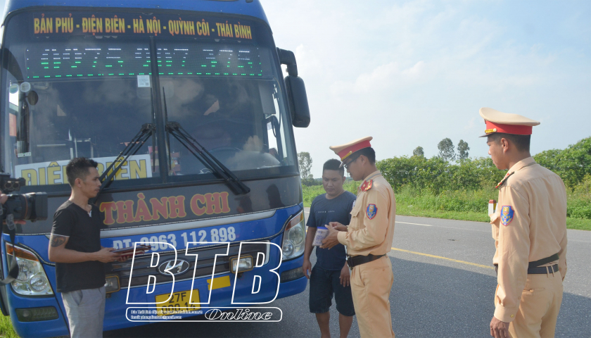 Lực lượng cảnh sát giao thông Công an huyện Quỳnh Phụ kiểm tra xe ô tô kinh doanh vận tải hành khách.