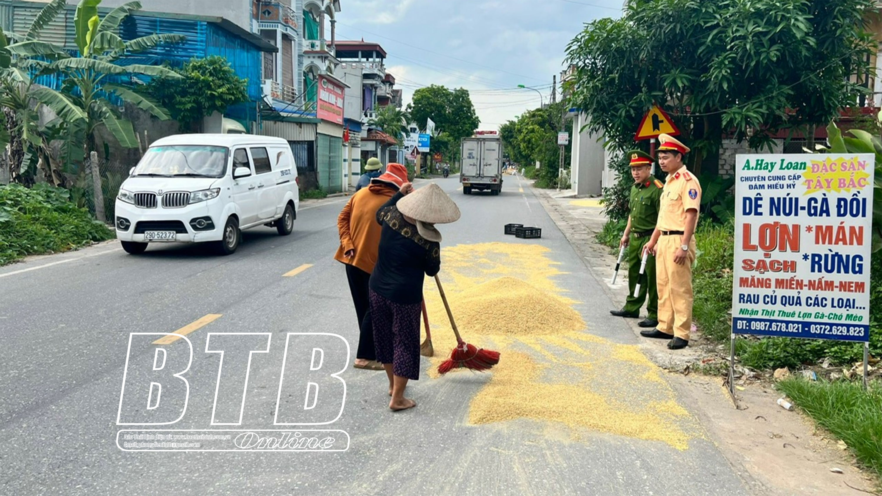 Lực lượng Công an huyện nhắc nhở người dân không phơi nông sản trên các tuyến đường giao thông.
