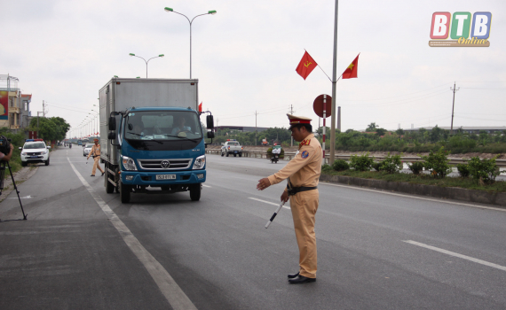 Lực lượng cảnh sát giao thông kiểm tra phương tiện lưu thông trên quốc lộ 10 đoạn qua địa phận huyện Vũ Thư.