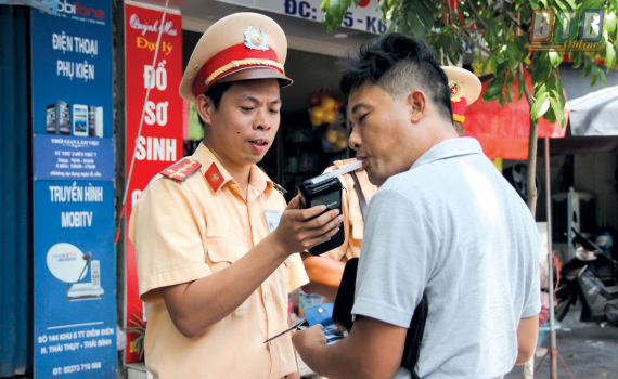 Lực lượng cảnh sát giao thông Công an huyện Thái Thụy kiểm tra nồng độ cồn người điều khiển phương tiện trên quốc lộ 37B đoạn qua địa bàn thị trấn Diêm Điền (Thái Thụy).