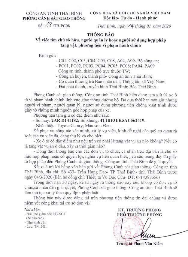 Phòng Cảnh sát giao thông, Công an tỉnh Thái Bình ra Thông báo số 18/TB-PC08 về việc tìm chủ sở hữu, người quản lý hoặc người sử dụng hợp pháp tang vật, phương tiện vi phạm hành chính