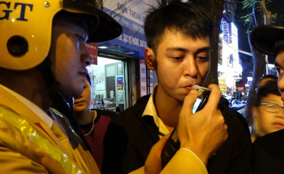 CSGT kiểm tra nồng độ cồn của tài xế.