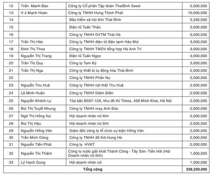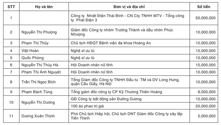 28 | Phan Thị Loan | Trưởng điều hành dinh dưỡng chăm sóc sức khỏe Thái Bình (Hội Doanh nhân nữ tỉnh) | 10,000,000 |