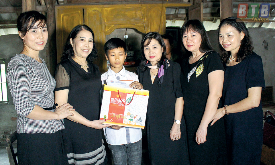 Hội Doanh nhân nữ tỉnh trao quà cho em Vũ Hải Lâm, học sinh Trường THCS Văn Lang (Hưng Hà).
