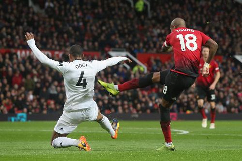 Với lợi thế sân nhà, M.U chẳng cần mất quá nhiều thời gian để chiếm lĩnh thế trận. Và ngay phút 13, Quỷ đỏ đã tìm được bàn phá vỡ thế quân bình. Nhận đường chuyền của Marcus Rashford, Young dũng mãnh đột phá bên cánh trái, vượt qua sự treo bám của Denis Odoi trước khi tung cú cứa lòng bằng chân phải trong khu cấm địa tung lưới Fulham.