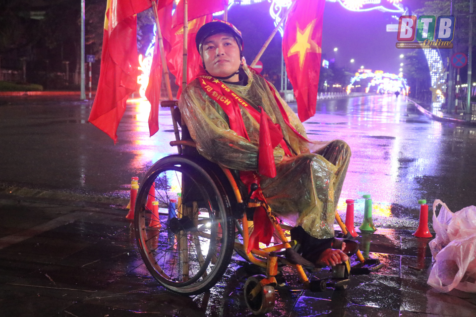 Một người hâm mộ trên chiếc xe lăn lặng lẽ xem đội tuyển Việt Nam thi đấu.