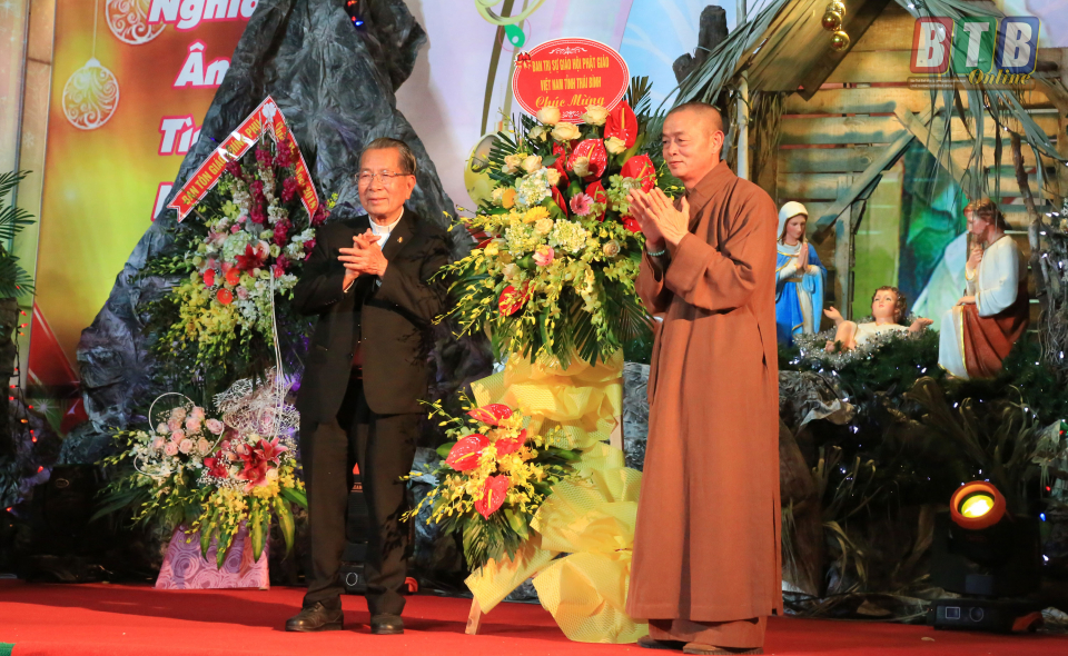 Đại diện Ban trị sự Giáo hội Phật giáo Việt Nam tỉnh tặng hoa chúc mừng nhân dịp Lễ Giáng sinh năm 2018 tại Toà Giám mục Thái Bình.