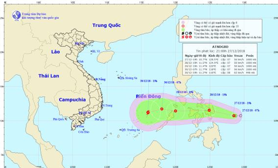 Hồi 19h tối qua (27/12), vị trí tâm áp thấp nhiệt đới ở vào khoảng 10,7 độ Vĩ Bắc; 128,5 độ Kinh Đông, cách bờ biển miền Trung Philippines khoảng 340km về phía Đông Đông Nam. Sức gió mạnh nhất vùng gần tâm áp thấp nhiệt đới mạnh cấp 7 (50-60km/giờ), giật cấp 9.