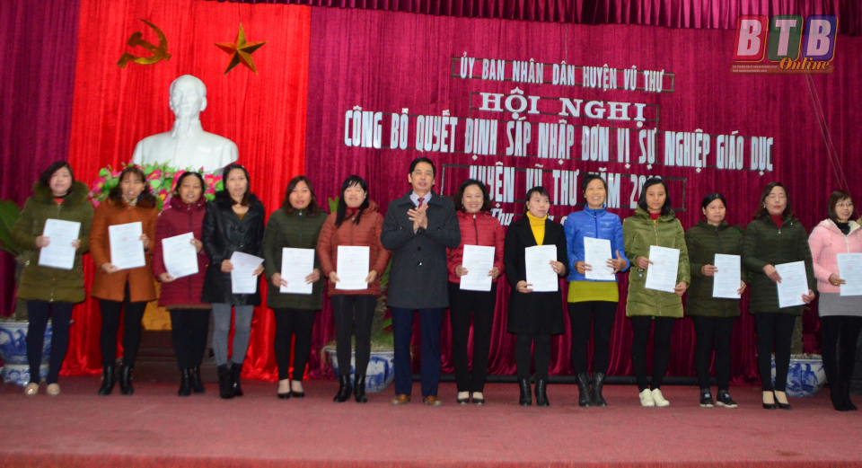Tại hội nghị, UBND huyện Vũ Thư công bố 17 quyết định về việc sáp nhập các trường học trong đó có: 6 trường mầm non sáp nhập thành 3 trường mầm non; 24 trường tiểu học, THCS thành 8 trường tiểu học và THCS và 4 trường tiểu học trong cùng một xã; tách Trường THCS Chu Văn An và nhập với Trường Tiểu học Hòa Bình và Tiểu học Tự Tân thành Trường Tiểu học và THCS Hòa Bình và Trường Tiểu học và THCS Tự Tân.