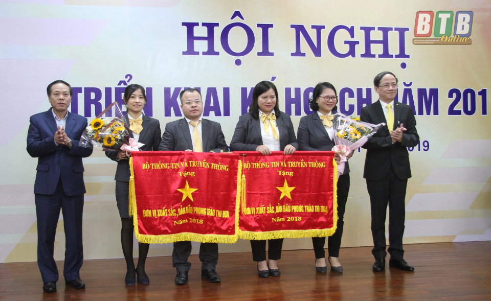Thừa ủy quyền của Thủ tướng Chính phủ, đồng chí Nguyễn Hoàng Giang, Tỉnh ủy viên, Phó Chủ tịch UBND tỉnh và lãnh đạo Tổng công ty Bưu điện Việt Nam trao cờ thi đua năm 2018 của Chính phủ cho Bưu điện tỉnh.