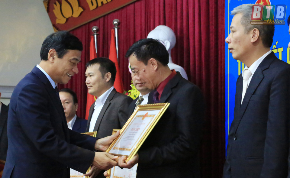 Đồng chí Đặng Trọng Thăng, Phó Bí thư Tỉnh ủy, Chủ tịch UBND tỉnh tặng Bằng khen cho các tập thể, cá nhân đạt thành tích xuất sắc tiêu biểu. Ảnh: Thành Tâm