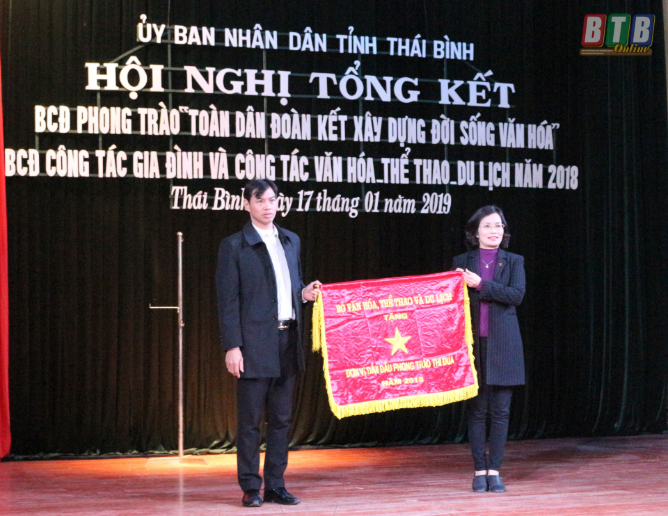 Thừa ủy quyền của Bộ trưởng Bộ VHTTDL, đồng chí Trương Thị Hồng Hạnh, Giám đốc sở VHTTDL trao cờ đơn vị dẫn đầu phong trào thi đua cho Phòng VHTT huyện Đông Hưng. Ảnh: Thanh Thưởng