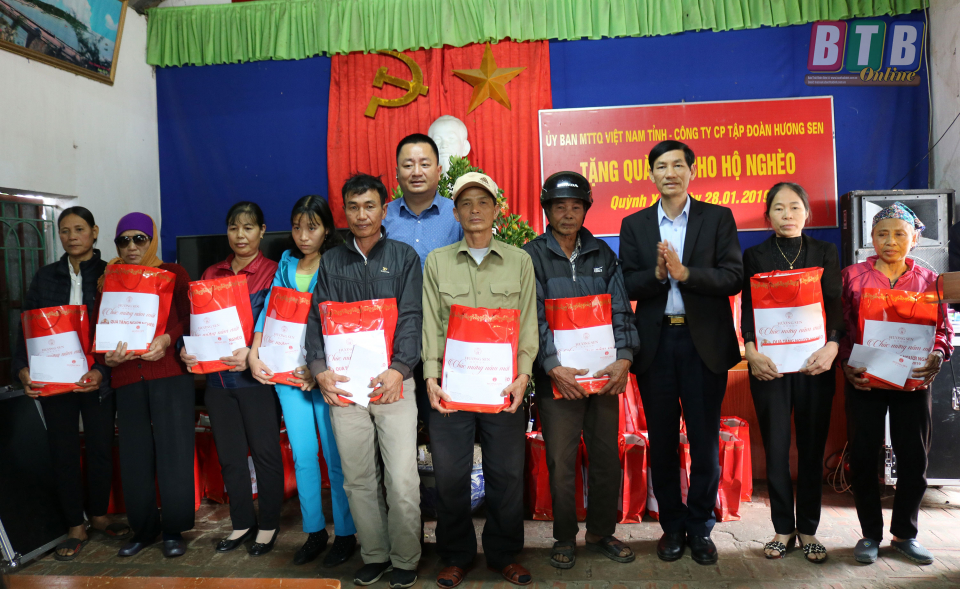 Nhân dịp Tết Nguyên đán Kỷ Hợi 2019, chiều ngày 28/1, Ủy ban MTTQ tỉnh, Công ty Cổ phần Tập đoàn Hương Sen đã trao tặng 233 suất quà cho hộ gia đình có hoàn cảnh khó khăn, người già neo đơn của 3 xã Đông Hải, Quỳnh Xá, An Vinh và người khiếm thị ở 38 xã, thị trấn của huyện Quỳnh Phụ.