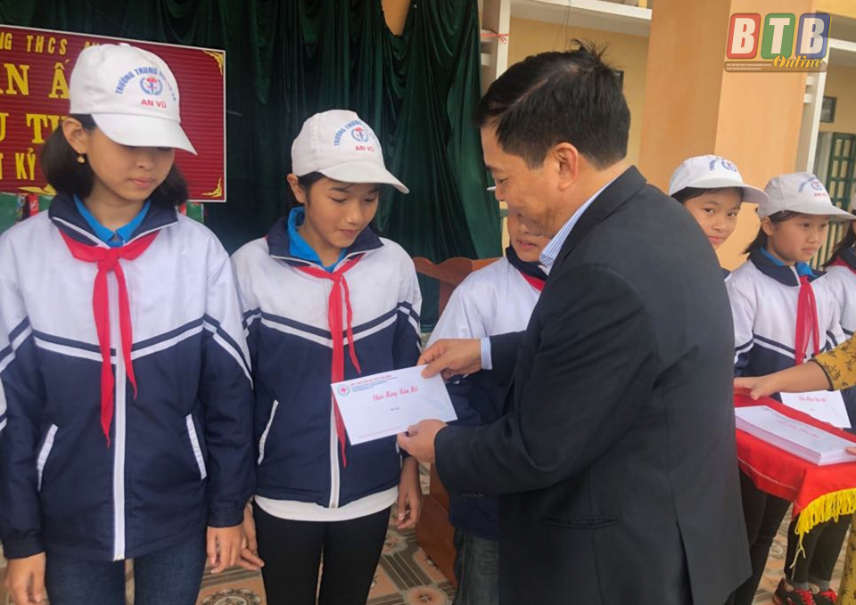 Tại chương trình, đồng chí Phó Chủ tịch UBND tỉnh đã tặng quà tết cho Trường THCS An Vũ và cùng Hội Chữ đỏ tỉnh trao 50 suất quà tết cho 50 em học sinh nghèo vượt khó đạt thành tích tốt trong học tập, mỗi suất quà trị giá 200.000 đồng.