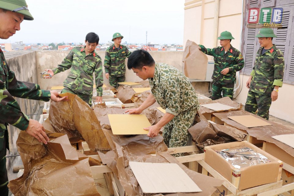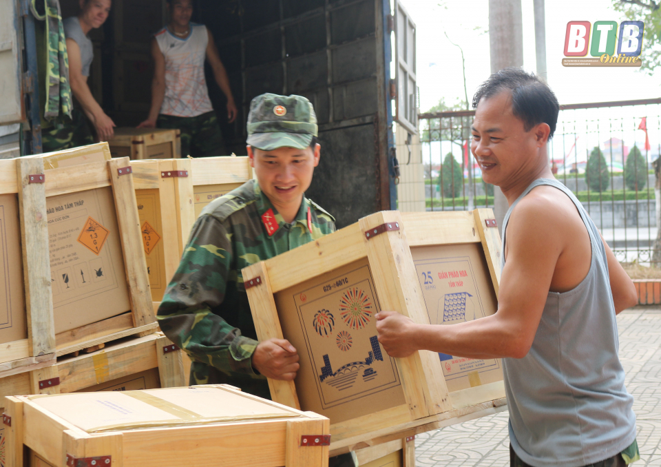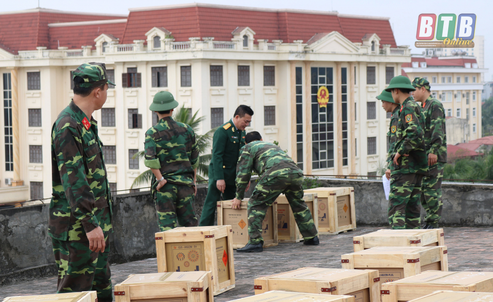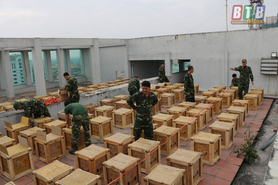 Ngay từ sớm, hơn 30 cán bộ, chiến sĩ Bộ CHQS tỉnh có mặt tại khu vực nhà Tỉnh ủy cũ tiến hành vận chuyển, lắp đặt trận địa pháo hoa ở khu vực Quảng trường 14-10, thành phố Thái Bình.