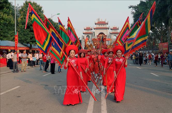 Nghi thức rước cờ tại Lễ hội đền Hai Bà Trưng xuân Kỷ Hợi 2019.