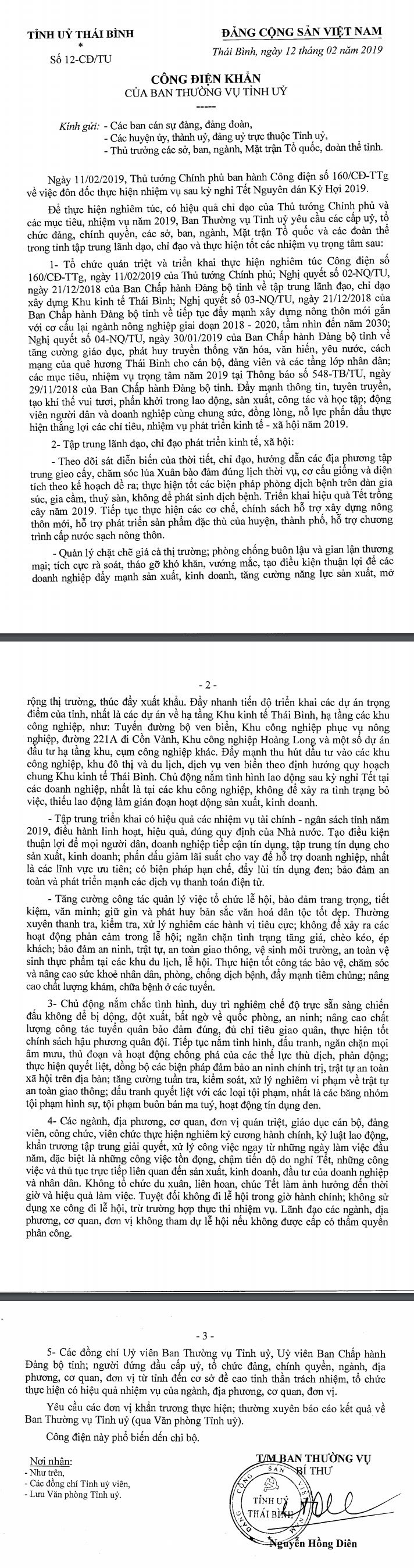 Công điện khẩn số 12-CĐ/TU của Ban Thường vụ Tỉnh ủy