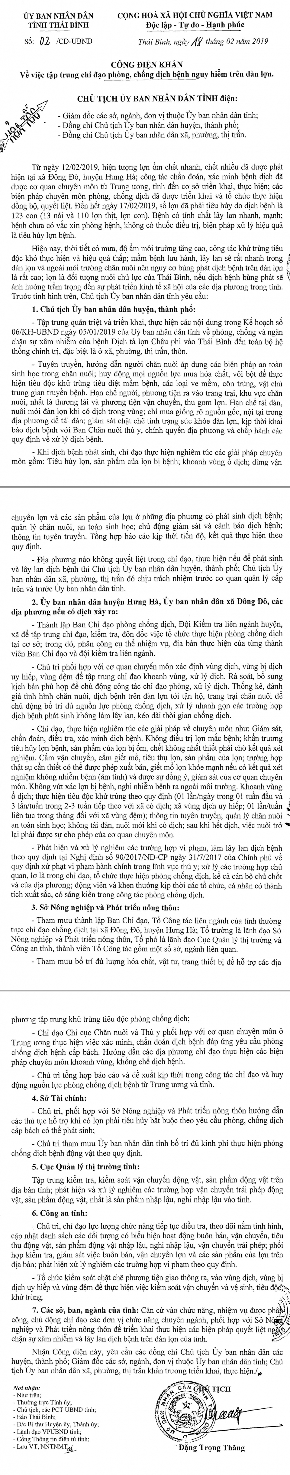 Ngày 18/02/2019, Ủy ban nhân dân tỉnh Thái Bình ra Công điện số 02/CĐ-UBND về việc tập trung chỉ đạo phòng, chống dịch bệnh nguy hiểm trên đàn lợn.