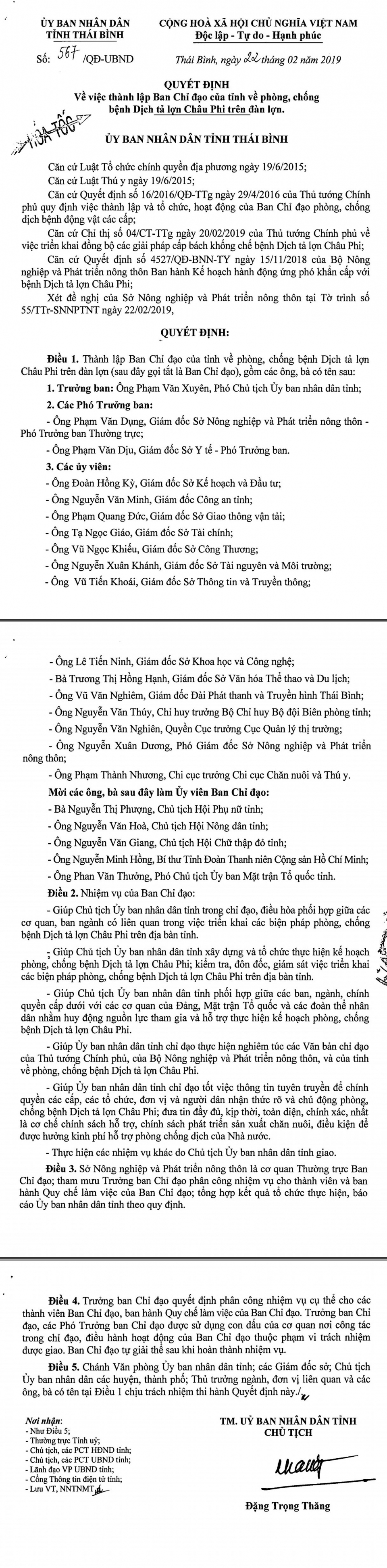 Ngày 22/02/2019, Ủy ban nhân dân tỉnh Thái Bình ra Quyết định số 567/QĐ - UBND về việc thành lập Ban Chỉ đạo của tỉnh về phòng, chống bệnh dịch tả lợn châu Phi trên đàn lợn.