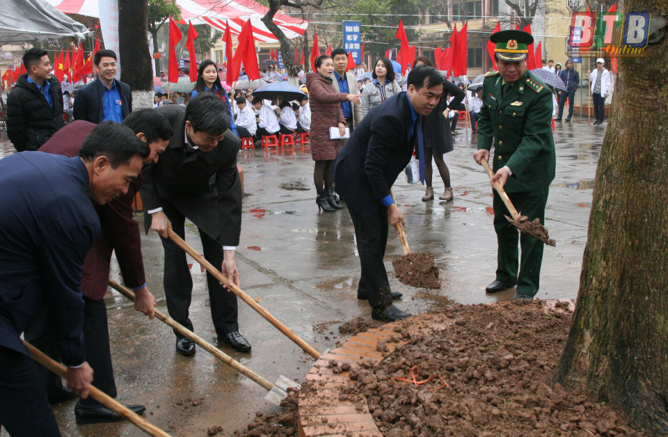 Các đại biểu tham gia trồng cây tại khuôn viên Trường THPT Nguyễn Du.