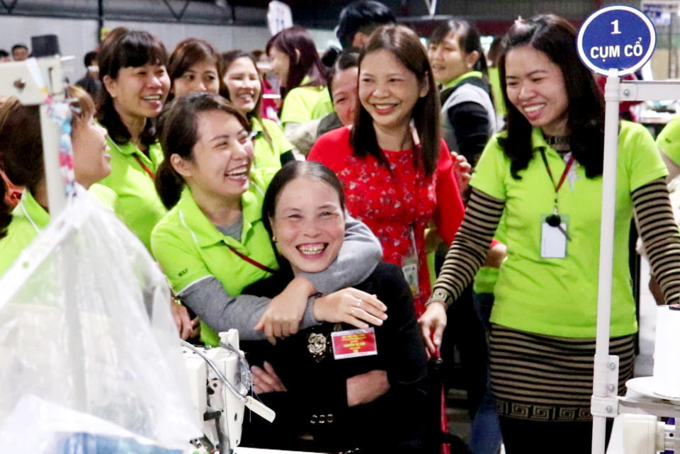 Công nhân Công ty Cổ phần Sản xuất hàng thể thao MXP gặp thân nhân tại nơi làm việc.