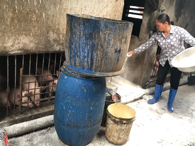 Lấy nguồn thức ăn cho lợn cùng địa chỉ với hộ gia đình ông Phạm Văn Kiên, hộ gia đình bà Lưu Thị Nái cách nhà ông Kiên 500m cũng đề cao cảnh giác, bà Nái rắc vôi bột nhiều lần trong ngày chỉ mong sao dịch bệnh không gõ cửa nhà mình