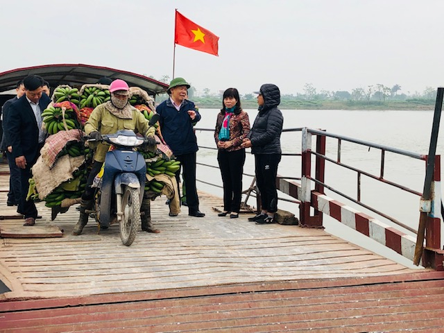 Bà Hoàng Thị Tố Nga, Phó Giám đốc sở Nông nghiệp và Phát triển nông thôn tỉnh Nam Định (thứ 2 từ phải qua) trực tiếp lên phà kiểm tra, dặn dò chủ phương tiện không cho người dân lưu thông thịt lợn không rõ nguồn gốc giữa huyện Trực Ninh và tỉnh Thái Bình