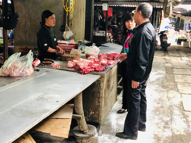 Các quầy thịt lợn ở chợ Cổ Lễ - điểm tiêu thụ thịt lợn lớn nhất huyện Trực Ninh cũng được đoàn kiểm tra liên ngành giám sát chặt chẽ