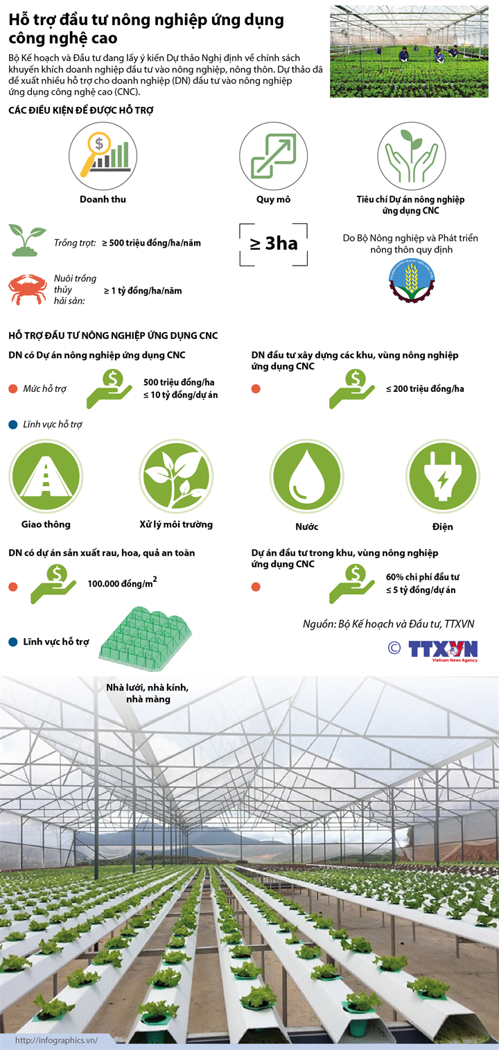 Bộ Kế hoạch và Đầu tư đang lấy ý kiến dự thảo Nghị định về chính sách khuyến khích doanh nghiệp đầu tư vào nông nghiệp, nông thôn. Dự thảo đã đề xuất nhiều hỗ trợ cho doanh nghiệp đầu tư vào nông nghiệp ứng dụng công nghệ cao.