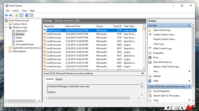 Trong Event Viewer, hãy lần lượt nhấp vào Windows Logs > Security. Khi đó danh sách các lần đăng nhập kèm theo ngày và giờ đăng nhập sẽ hiện ra. Mỗi lần bạn đăng nhập, Windows sẽ ghi lại các lần đăng nhập trong khoảng thời gian trước đó khoảng 2 đến 4 phút.