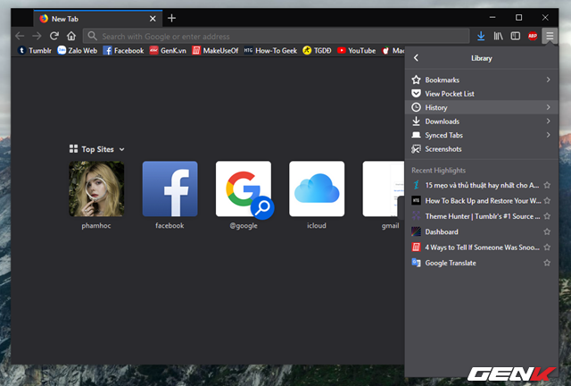 Với Firefox thì bạn hãy nhấp vào biểu tượng menu mở rộng và truy cập vào Library > History.