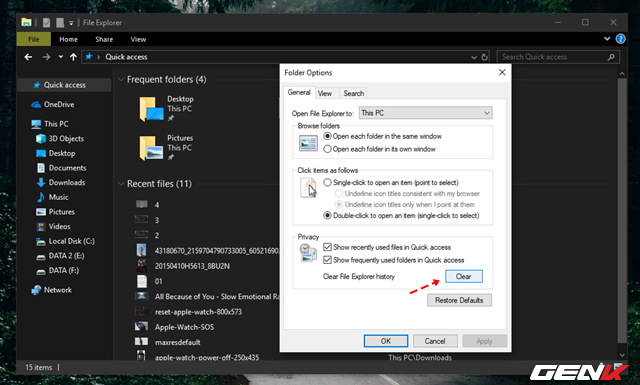 Mặc dù Quick access khá hay nhưng bất cứ ai cũng có thể xóa hoạt động gần đây khỏi máy của bạn. Chỉ cần nhấp chuột trái vào Quick access > Options > Clear File Explorer History.