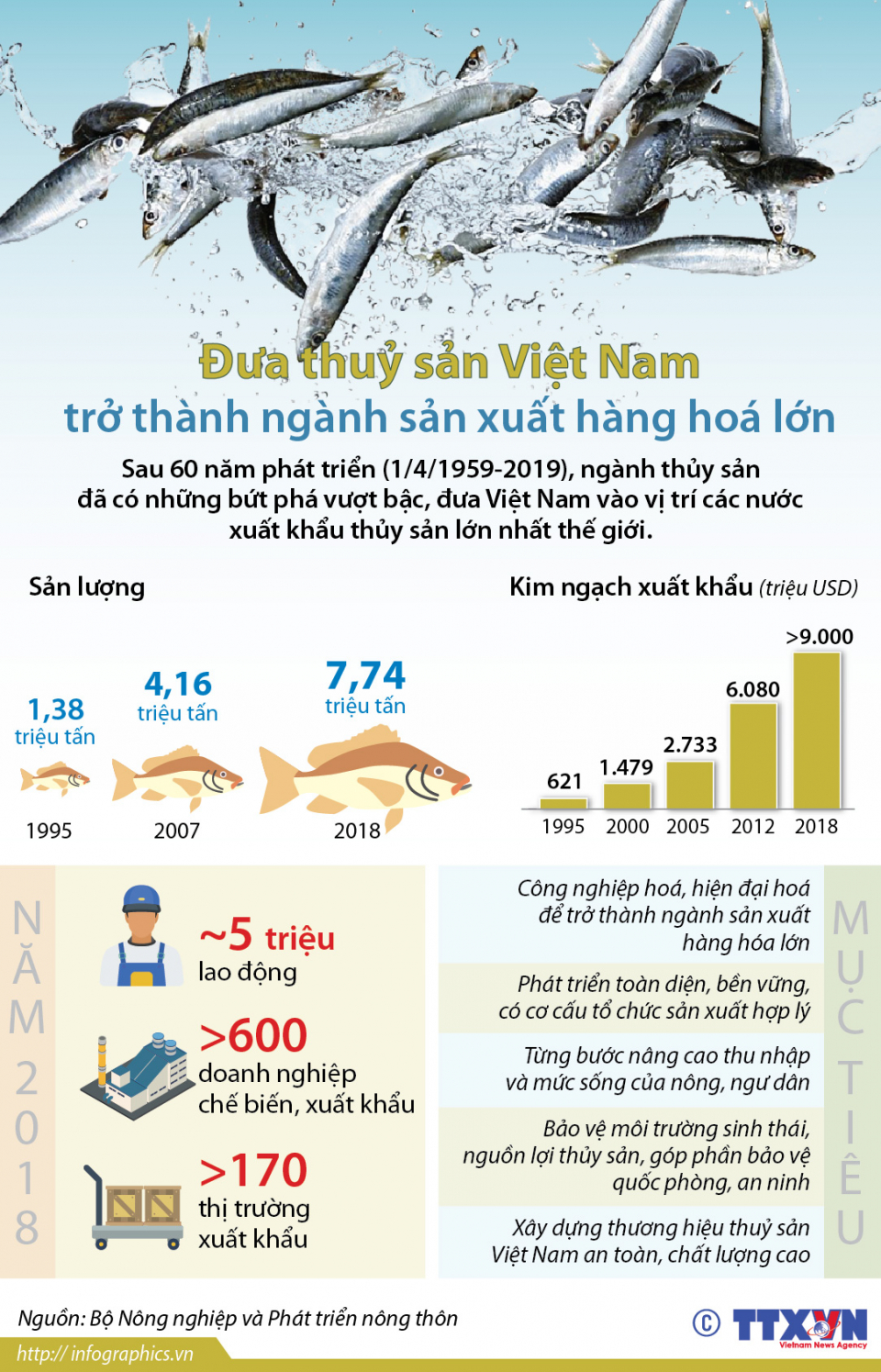 Sau 60 năm phát triển (1959 - 2019), ngành thủy sản đã có những bứt phá vượt bậc, đưa Việt Nam vào vị trí các nước xuất khẩu thủy sản lớn nhất thế giới.
