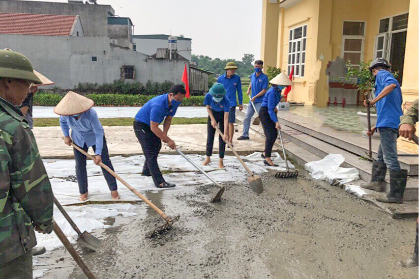 ĐVTN huyện Đầm Hà ra quân hỗ trợ làm sân bê tông nhà văn hóa thôn Trại Cao, xã Đầm Hà, huyện Đầm Hà. Ảnh: Hoàng Giang.