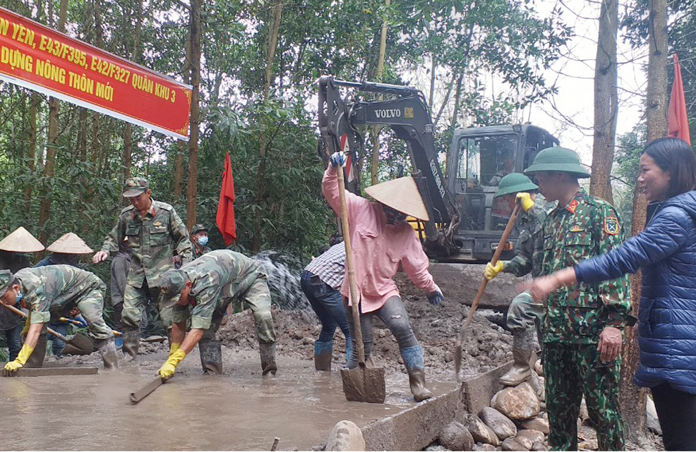LLVT huyện Tiên Yên và Trung đoàn 43, Trung đoàn 42 giúp thôn Hồng Phong, xã Phong Dụ (Tiên Yên) đổ bê tông đường dân sinh. Ảnh: Văn Đảm (CTV)